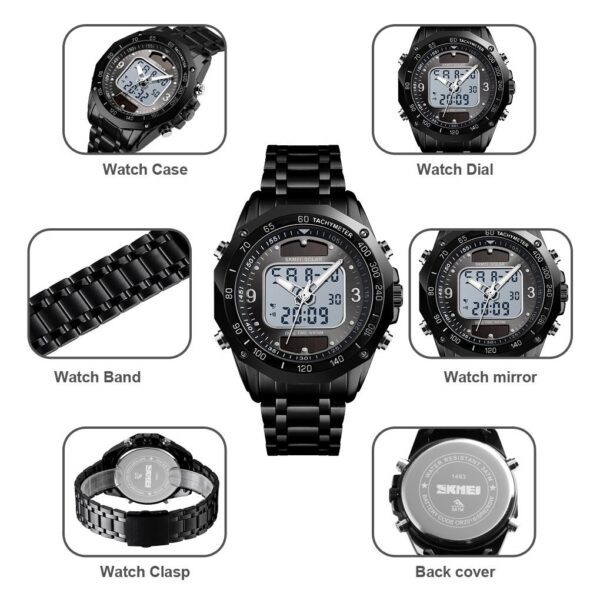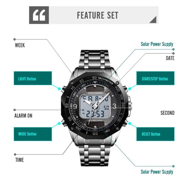 Chức năng: 2 mặt đồng hồ, Bấm giờ, Báo thức, Ngày, Tuần, Đèn nền, Đồng hồ hiển thị 12/24 giờ