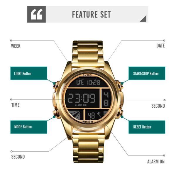 Tính năng: Hiển thị thời gian, Bấm giờ, Báo thức, Hiển thị ngày/tuần, Đèn EL, Đồng hồ 12/24 giờ