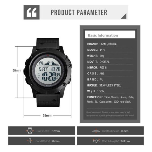 Đặc điểm: 2 kiểu hiển thị thời gian, Đồng hồ bấm giờ, Đèn, Hiển thị ngày, Báo thức hẹn giờ, Hiển thị tuần, Âm báo hàng giờ, Hệ thống 12/24 giờ, Đếm ngược