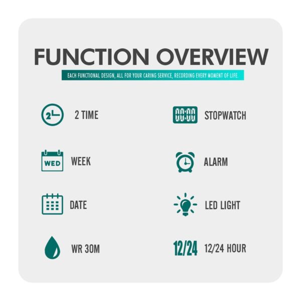 Chức năng: Đèn LED, Bấm giờ, Báo thức, 12/24 giờ, ngày, tuần.